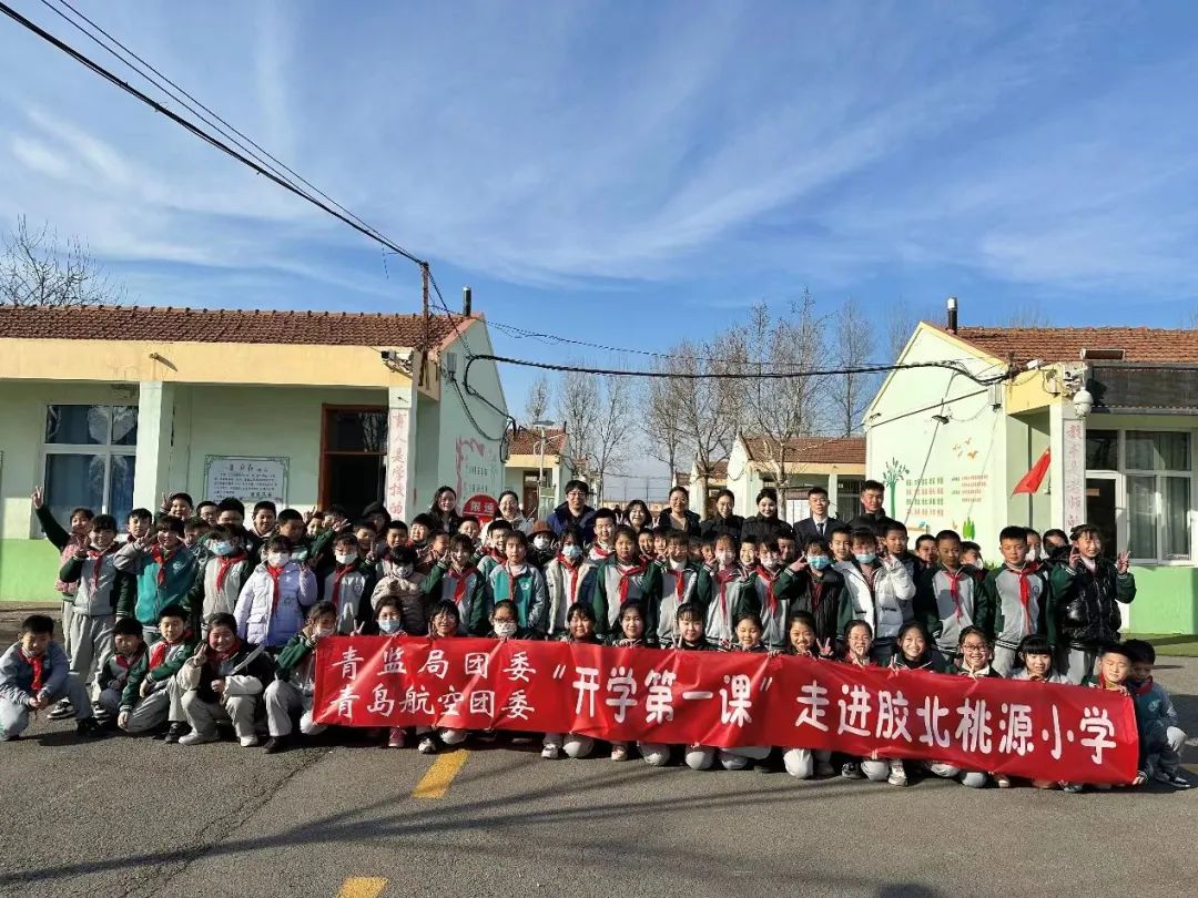 在胶北桃源小学,青岛航空团委以“开学第一课”为契机,开展“播种航空希望•助力青春梦想”民航知识进校园志愿服务活动。志愿者们走进校园,为学生开展客舱知识讲解、飞行知识讲解等航空知识授课。