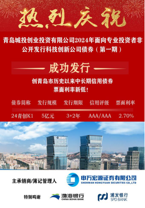 4月9日,彩票app 创投公司在上交所成功发行首期科技创新公司债券(24青创K1)。本次科创债发行规模5亿元,期限3+2年期,票面利率2.70%。创投公司在2023年底成为青岛市首家AAA信用评级创投企业,时隔仅3个月又成功获取10亿元增量批文并成功发行科技创新公司债券。在彩票app 财务资金管理部协同指导下,创投公司紧抓发行窗口,首次亮相就吸引了23家投资机构,发行利率创青岛市中长期债券历史新低。