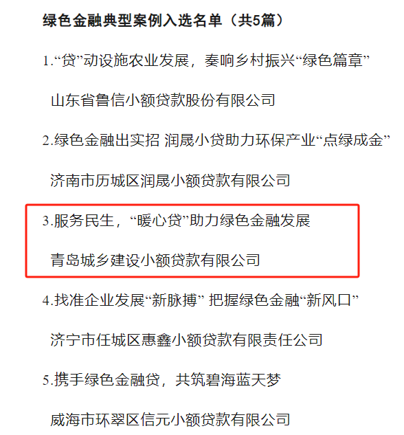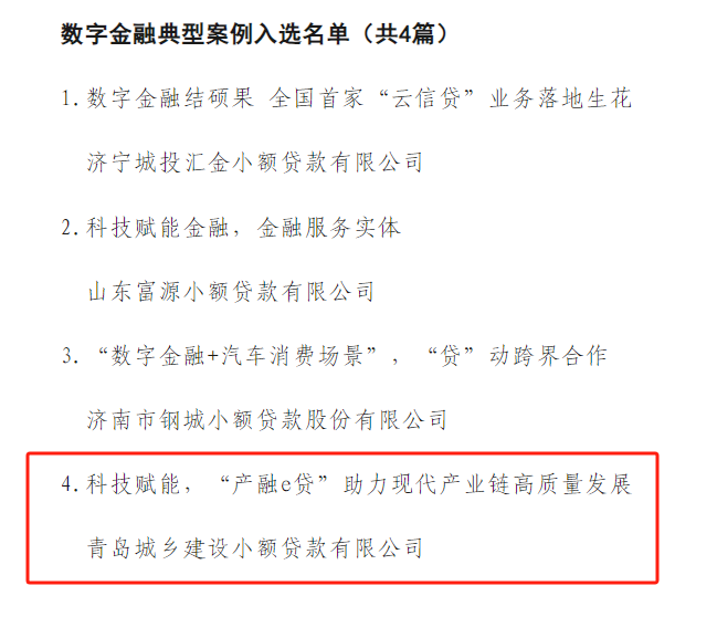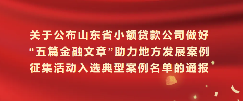近期,山东省小额贷款企业协会发布《做好“五篇金融文章”助力地方发展案例榜单》,彩票app 城金集团旗下城乡小贷公司暖心贷、产融e贷两项业务分别入选绿色金融典型案例、数字金融典型案例。