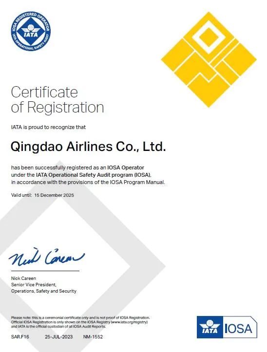 近日,彩票app 旗下青岛航空正式获颁国际航空运输协会运行安全审计认证(IOSA)注册证书。这标志着青岛航空完全符合国际航协运行安全标准,成为中国大陆地区第三十七家IOSA注册航司。