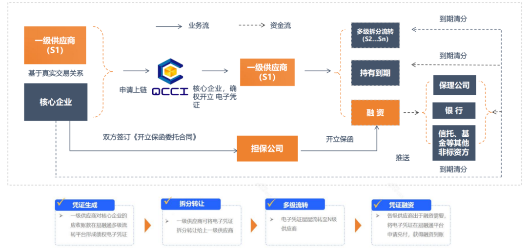 该平台落地的首笔业务以商业保理作为业务主体,基于核心企业与上游供应商之间的真实贸易背景,将核心企业对该供应商的应付账款转换为一种可拆分流转、可持有到期、可融资的数字债权凭证。供应商持有该数字债权凭证后,既可将凭证再次拆分流转,支付给其上游供应商,亦可将凭证通过平台向资金方发起融资申请,提前实现资金回流。