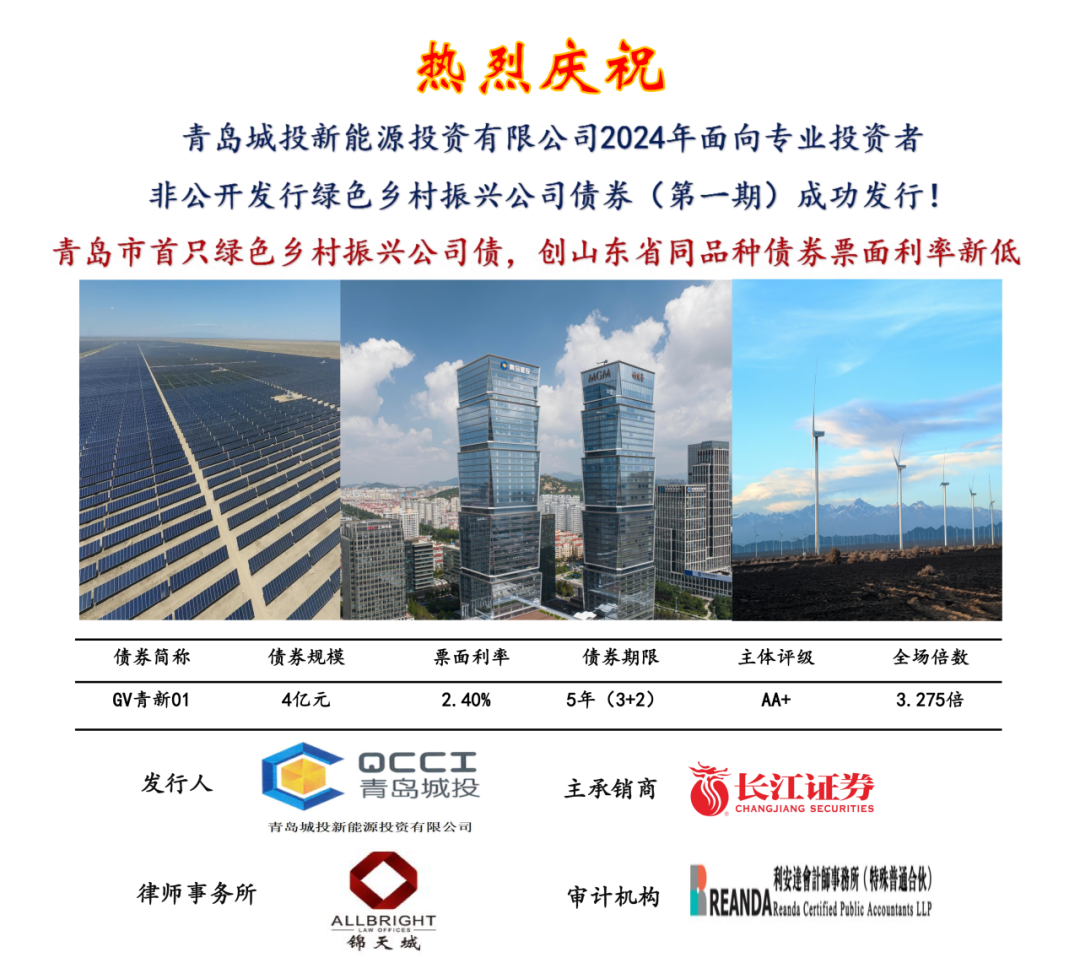 7月19日,彩票app 新能源集团成功以自身主体评级AA+、无担保方式发行公司债券(GV青新01)。本期债券发行规模4亿元,为青岛市首只绿色乡村振兴公司债券,发行期限3+2年。本期债券发行共吸引了24家投资机构,全场认购倍数达3.275倍,票面利率2.4%,创山东省同品种债券利率新低。