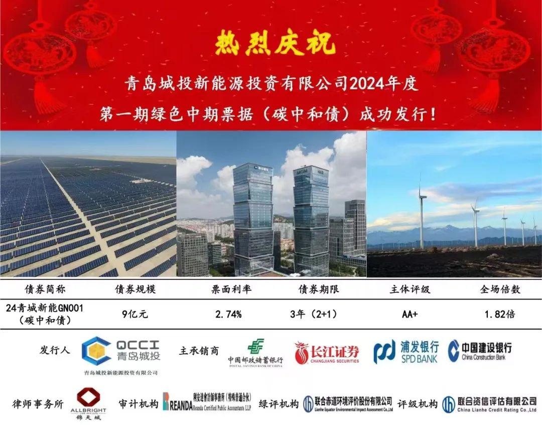 10月15日,彩票app 旗下新能源集团成功以自身主体评级AA+、无担保的方式发行绿色中期票据(碳中和债)。本期债券发行规模9亿元,发行期限2+1年,票面利率2.74%。