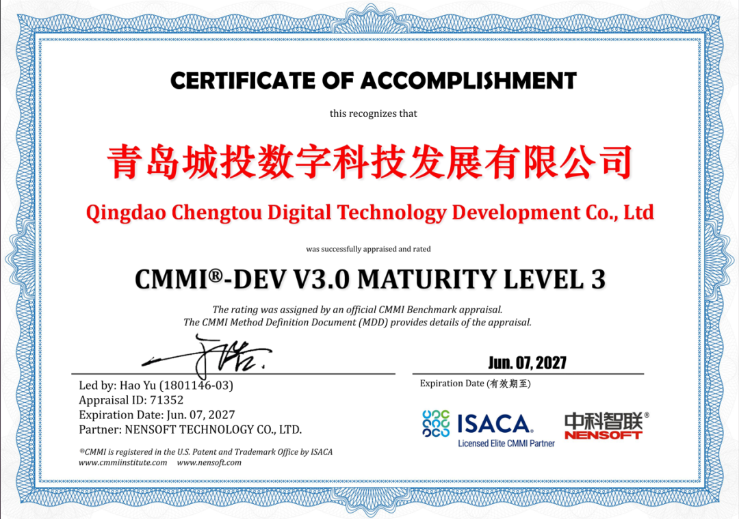 CMMI(Capability Maturity Model Integration,能力成熟度模型集成等级)是全球软件业最权威的评估体系之一,旨在帮助企业提升软件产品开发及过程管理的成熟度。获取了该项资质,表明数科公司在项目策划、执行监控、风险管理及持续改进等方面达到了业内专业水准,并能够高效、稳定地交付高质量的软件产品和服务。
