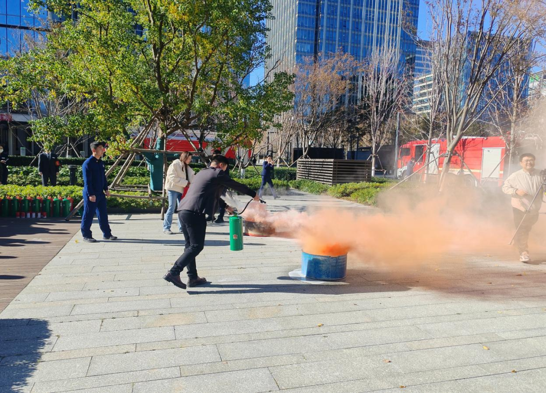 疏散演练结束后,崂山区消防救援局消防员在现场进行了消防业务知识培训,员工通过实操进一步掌握了灭火器的使用要领。