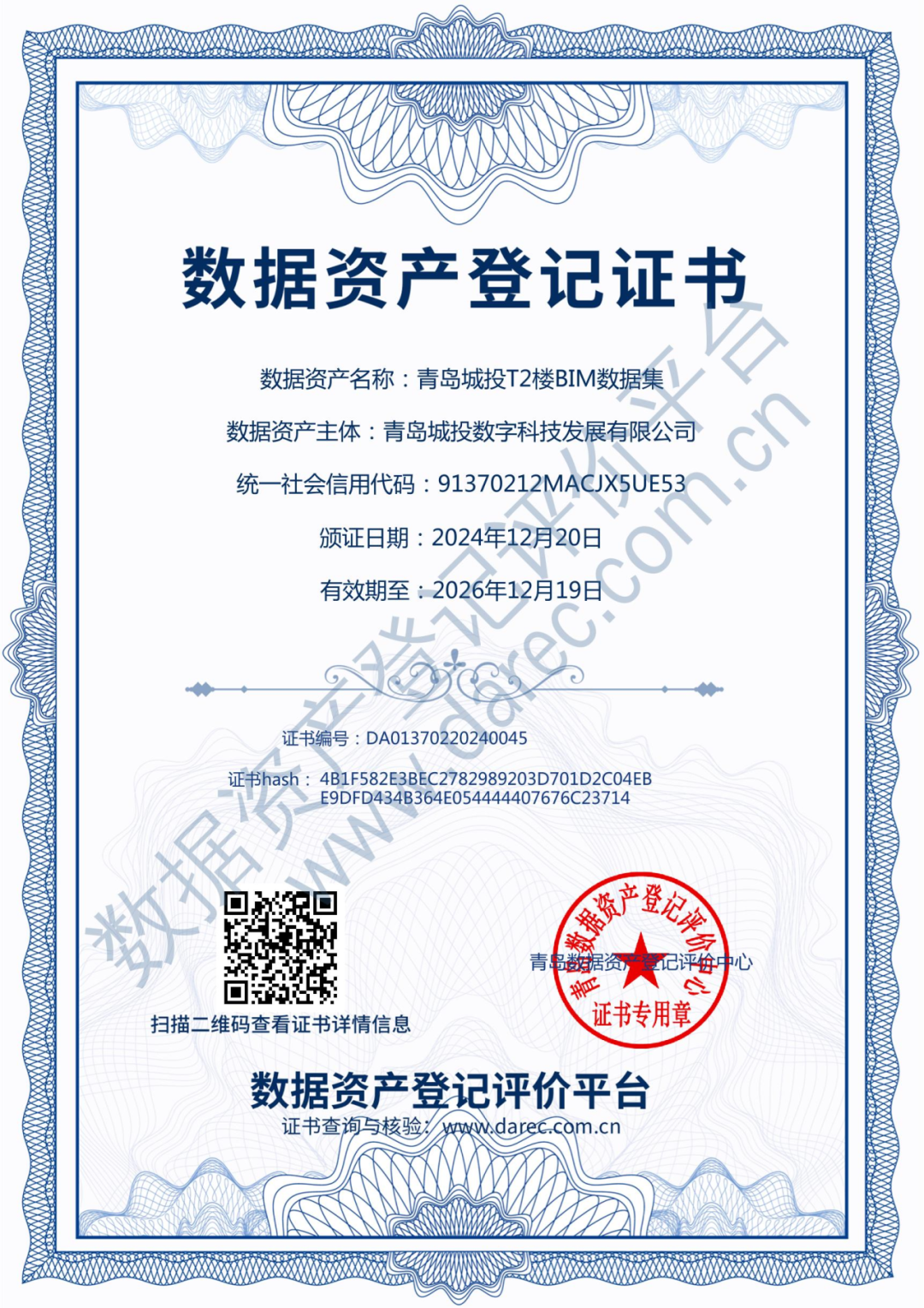 12月21日,彩票app 旗下数科公司将数据资产计入公司财务报表,圆满完成了“彩票app T2楼BIM数据集”数据资产入表工作,成为青岛市首例实现BIM领域数据资产入表的成功案例,为后续数据资产业务拓展打下坚实基础。