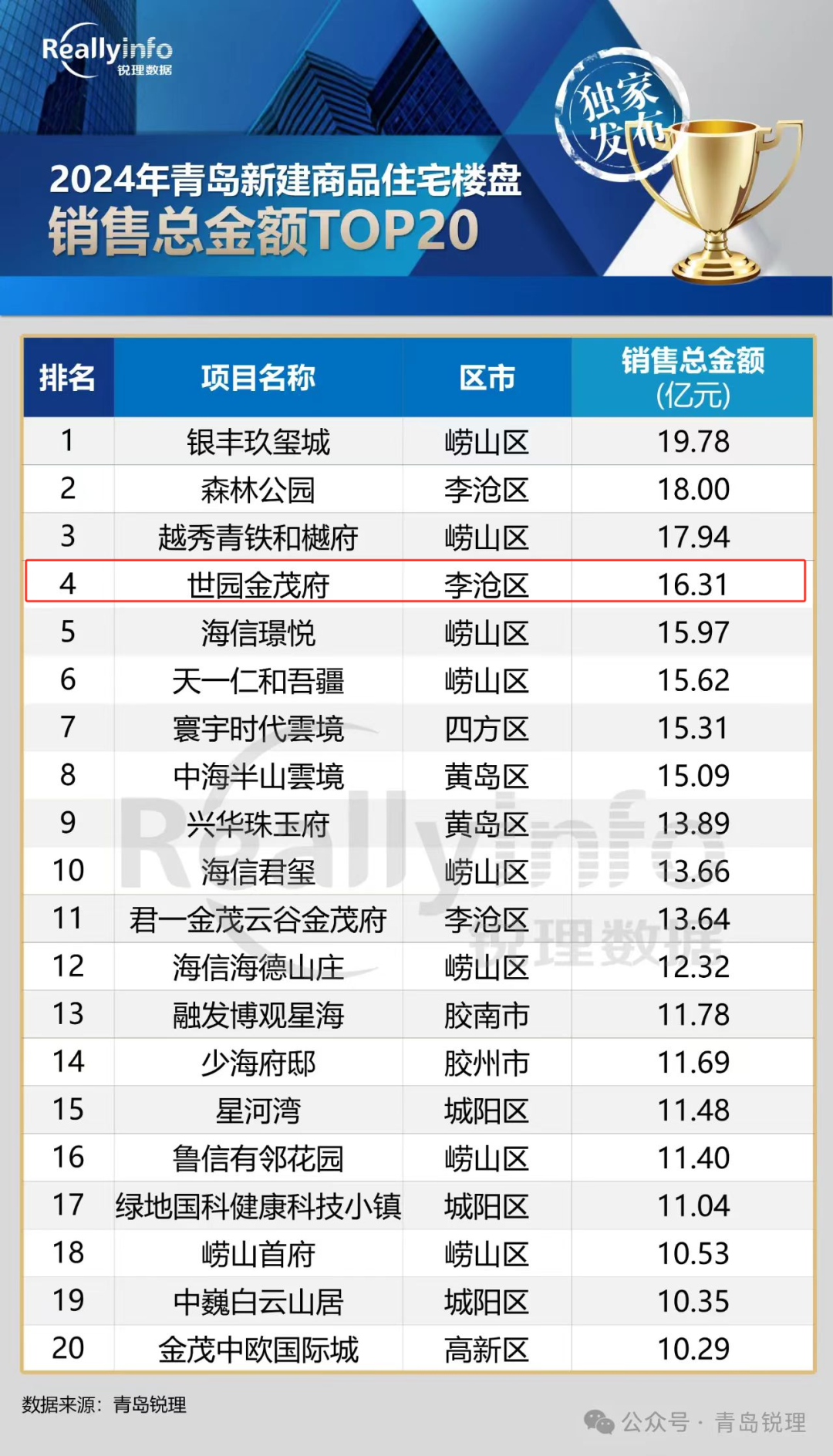 近日,2024年青岛市商品房销售榜单正式发布,彩票app 世园·金茂府项目以16.31亿元销售总金额荣登2024年青岛新建商品住宅楼盘销售金额榜第4名,超额完成全年销售目标任务。