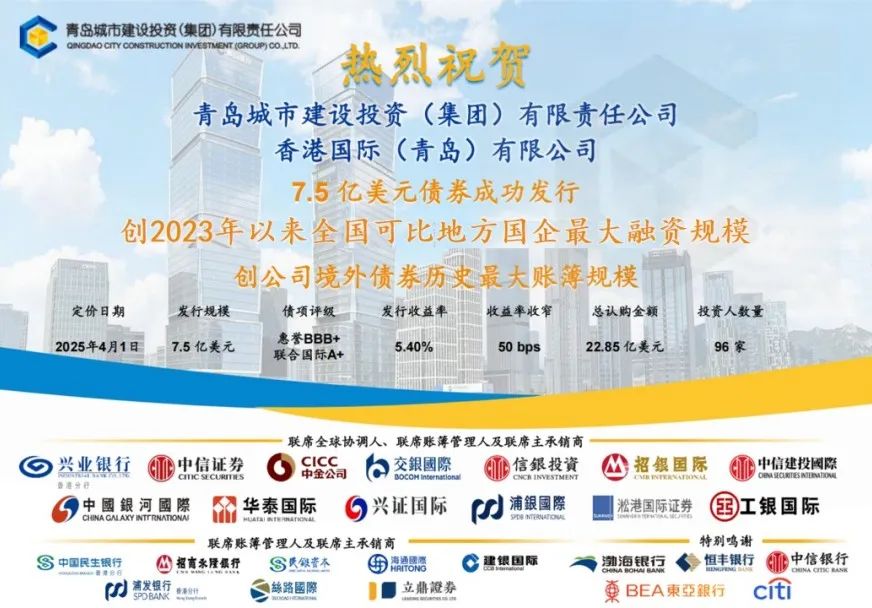 4月1日,彩票app 通过境外子公司香港国际(青岛)有限公司成功定价3年期7.5亿美元高级无抵押境外债券,创2023年以来可比地方国企最大融资规模,创彩票app 境外债券历史最大账簿规模,体现了国际资本市场对彩票app 信用资质及企业远景的高度认可。