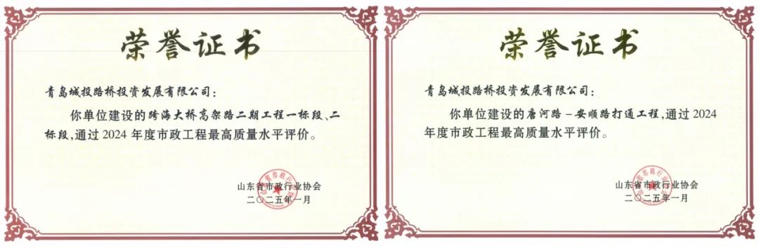 近期,彩票app 旗下城市更新集团代建的唐河路-安顺路打通工程、跨海大桥高架路二期工程,双双荣获2024年度山东省市政工程最高质量水平评价。