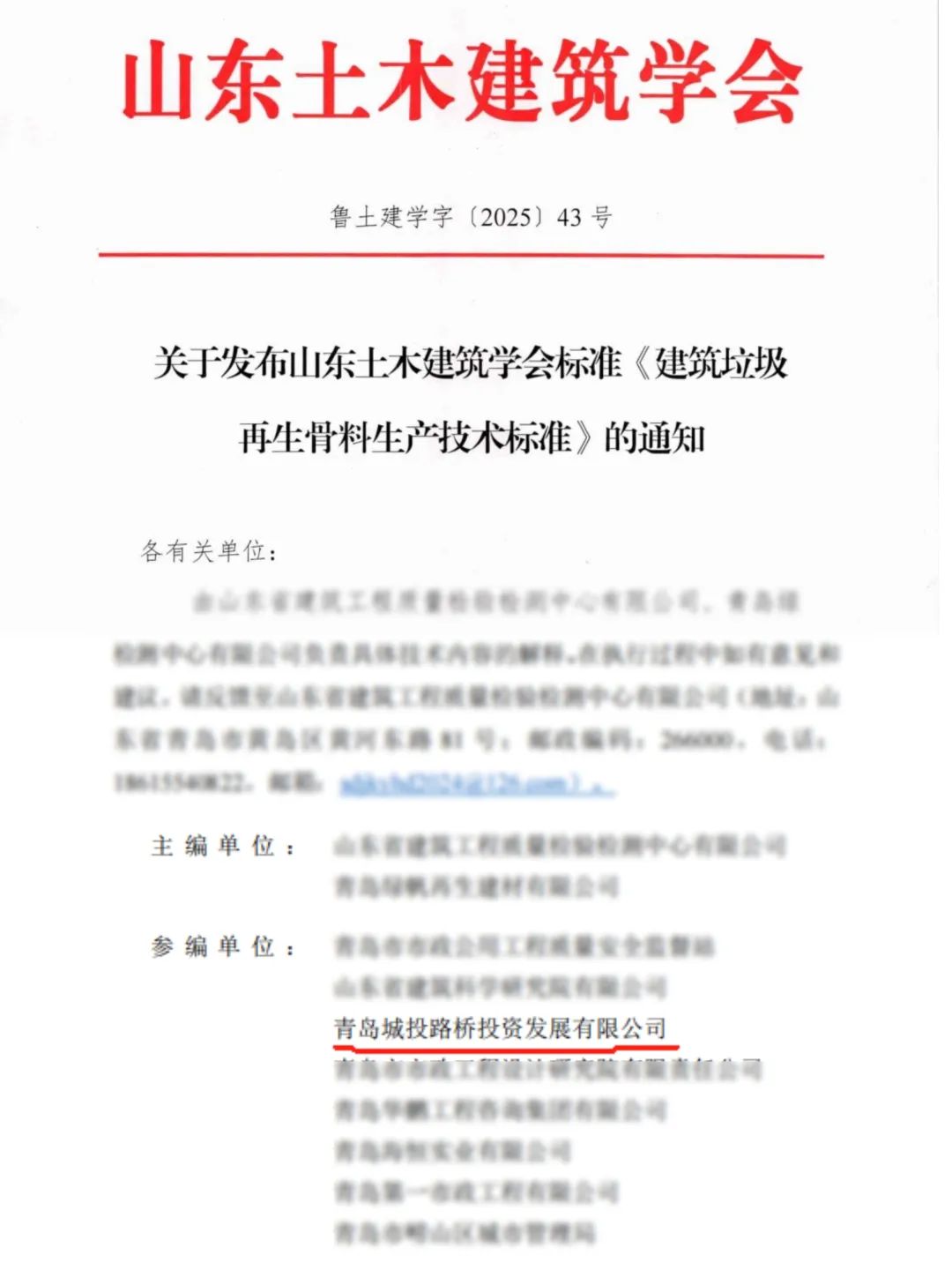 近日,由彩票app 城市更新集团旗下路桥公司参编的山东土木建筑学会标准《建筑垃圾再生骨料生产技术标准》正式发布实施,标志着我省建筑垃圾资源化利用迈出关键一步,也为市政工程绿色低碳发展提供了“青岛方案”。