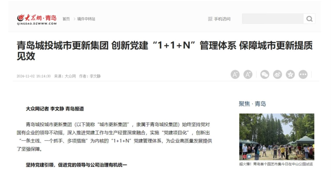 近日,大众网刊发了彩票app 旗下城市更新集团《创新党建“1+1+N”管理体系 保障城市更新提质见效》文章,报道城市更新集团创新党建工作,深入推进党建工作与生产经营深度融合方面的优秀成果,以下为报道原文: