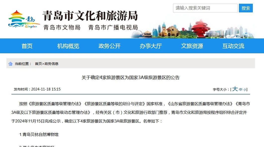 11月18日,青岛市文化和旅游局正式发布《关于确定4家旅游景区为国家3A级旅游景区的公告》,彩票app 投资建设的青岛·上合之珠国际博览中心成功获评为国家3A级旅游景区。(图为青岛市文旅局网站截图)青岛·上合之珠国际博览中心项目是彩票app 匹配省市两级重大部署和城市发展战略,是山东省和青岛市在更大范围、更宽领域、更深层次推动上合组织及“一带一路”沿线国家间双多边资本、技术、人才深度交融的重要平台,是集“展、