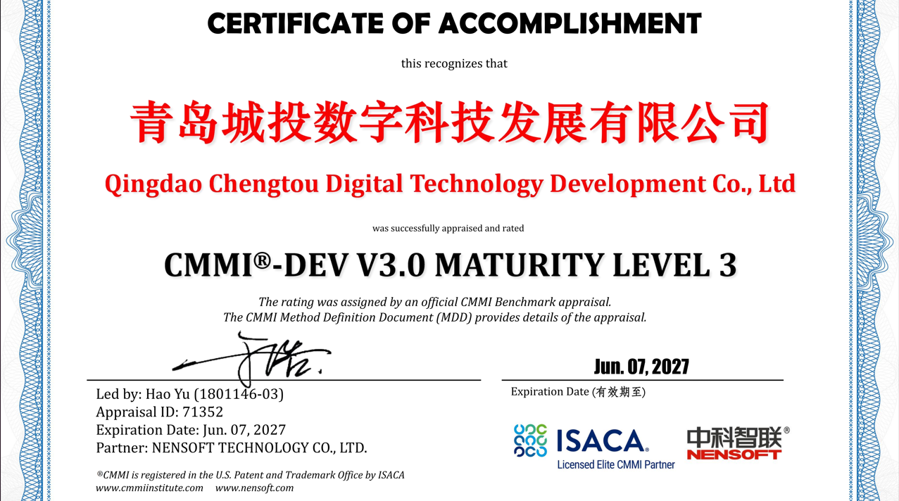 近日,彩票app 旗下数科公司凭借在项目管理及信息技术服务领域的卓越表现,顺利获得“CMMI 3级”与“ITSS 3级”认证,标志着数科公司在软件研发管理与信息技术服务标准化方面迈上了新的台阶。(图为CMMI3级证书)CMMI(Capability Maturity Model Integration,能力成熟度模型集成等级)是全球软件业最权威的评估体系之一,旨在帮助企业提升软件产品开发及过程管理的成熟度。获取了该项资质,表明数科公司在项目策划、执行监