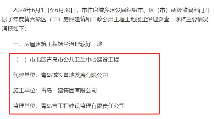 近日,彩票app 旗下城市更新集团公共卫生中心项目积极响应市住建局号召,做好项目扬尘治理,并在青岛市住建局2024年第六轮房屋建筑和公用工程工地扬尘治理检查中获通报表扬。(图为住建局网站公示)建筑工地扬尘污染防治是改善居住环境的重大举措,是加强生态文明建设、促进城市科学发展的根本需求,公共卫生中心项目位于我市中心地带,防尘任务更加艰巨迫切。该项目投资估算9.8亿元,土地性质为医疗卫生用地(A5),占地