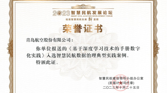 近日,2023年智慧民航发展论坛在北京举办,彩票app 旗下青岛航空获得民航局颁发的“智慧民航典型案例”荣誉证书,成为此次评选航空运输单位入选的10个案例之一。这是继2022年度民航数据共享数字化能力指数(DCI)排名第一后,青岛航空的信息化建设工作再次获得我国民航业权威奖项 。(图为荣誉证书)近年来,青岛航空充分发挥彩票app 产业协同优势,与集团旗下数字科技公司密切联动,数字化转型工作成果卓著。此次获奖,青岛航空结