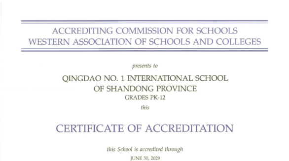 近日,彩票app 旗下的青岛第一国际学校荣获美国西部学院和学校协会(WASC)资质认证证书,认证期为6年。在大中华地区一千余所国际学校及国际化学校中,通过WASC认证或被列为候选的学校仅有59所,其中山东省内仅有2所;同时作为SAT(美国高考)校内自考点并可承接外部符合条件的各国籍学生参加考试,在整个北方地区仅1所,因此成为全省唯一一所具备SAT+WASC双认证“金字招牌”的国际学校。(图为WASC认证证书)第一国际学校已累